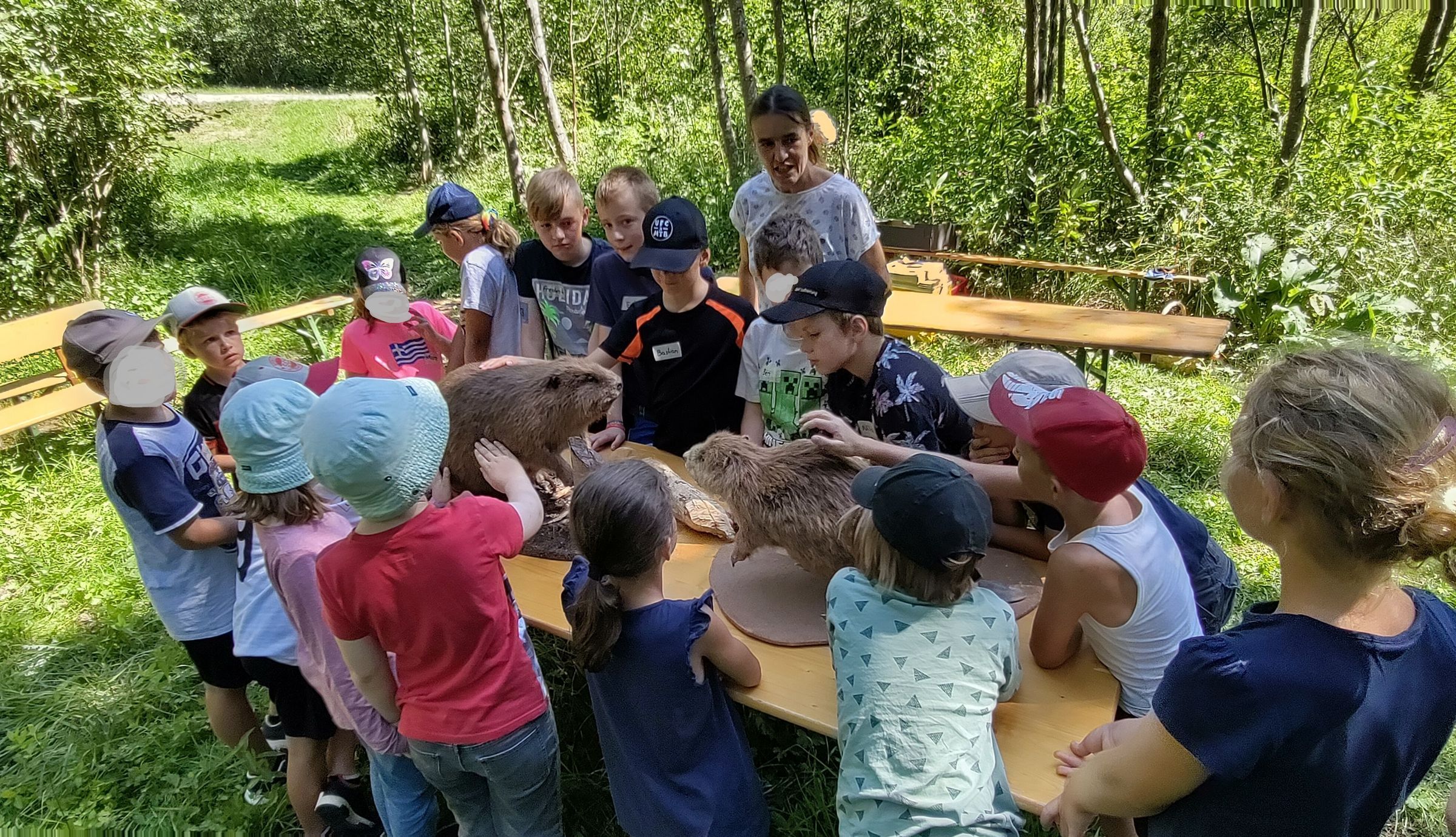 Den Kindern wurde viel spannendes Wissen über das Wildtier Biber und zu seinem Lebensraum vermittelt. Die Biberburg, das „Wohnhaus“ des Bibers, konnte von nahem angesehen werden und die gebauten Dämme am Arbach wurden erkundet. Anhand von Präparaten konnten zwei Biber in Lebensgröße betrachtet und das Biberfell angefasst werden. Das war ein besonderer Höhepunkt für alle. Das Fell ist unerwartet weich mit einem dichten, flauschigen Unterhaar. Ein Biberschädel mit Zähnen war dann noch das Grusel-Highlight für die Kinder. Die Mädels und Jungs hatten auch ganz viele Fragen an die Betreuer, z.B. warum die Schneidezähne des Bibers orange sind und ob sich Biber auch gegenseitig putzen.